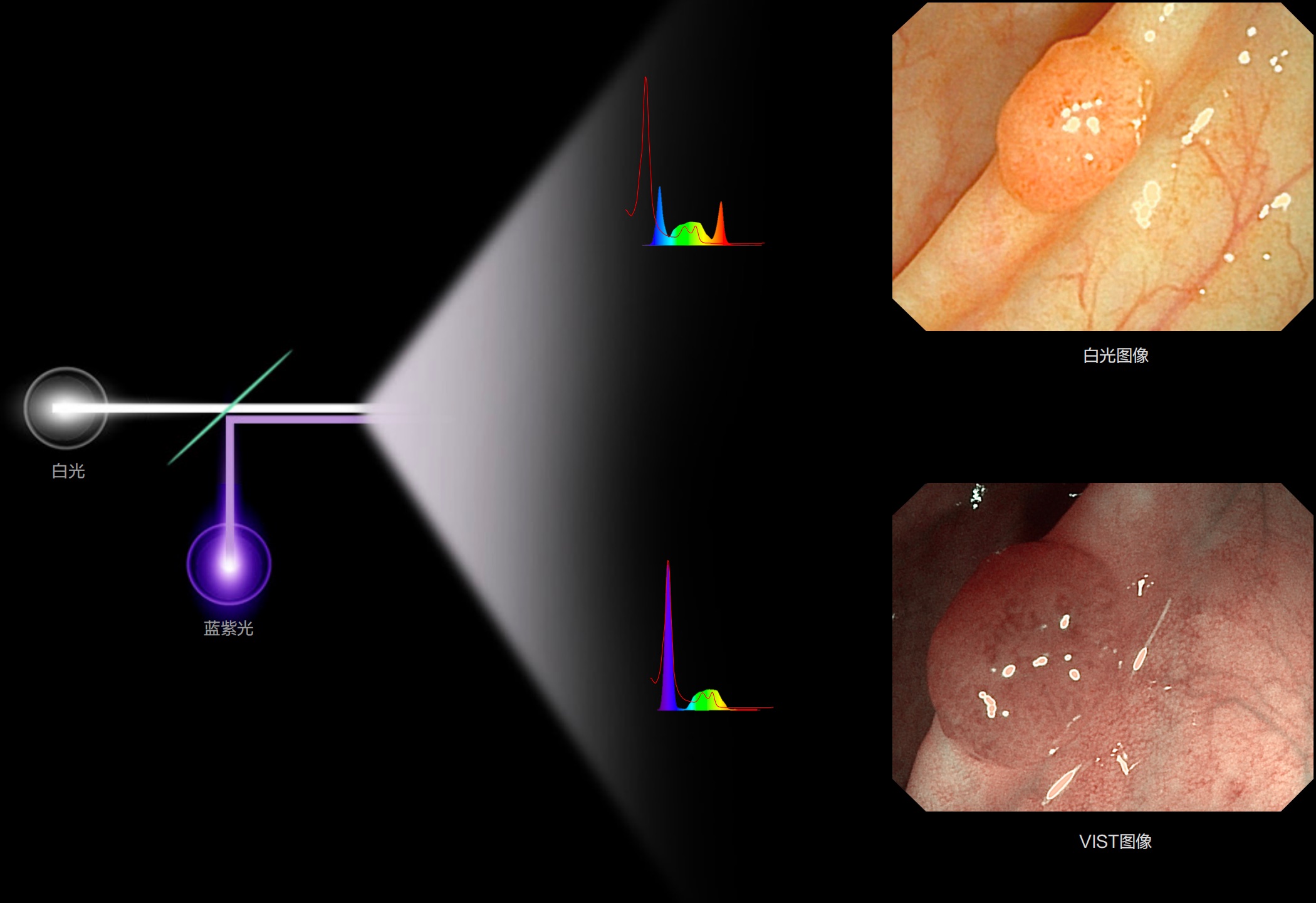 能够凸显黏膜浅层和中层血管轮廓,适用于中、远景观察下的病灶识别和早癌筛查。